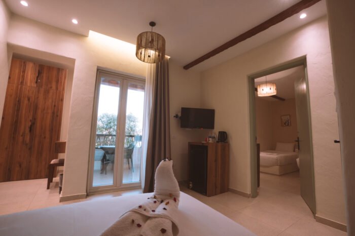 suite consistent from two separated rooms with connected balcony pyramids view Room one: King bed with pyramids view & Jacuzzi Room Two: 3 beds with...